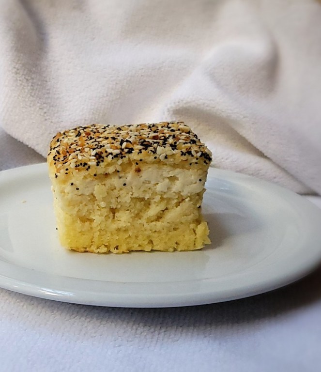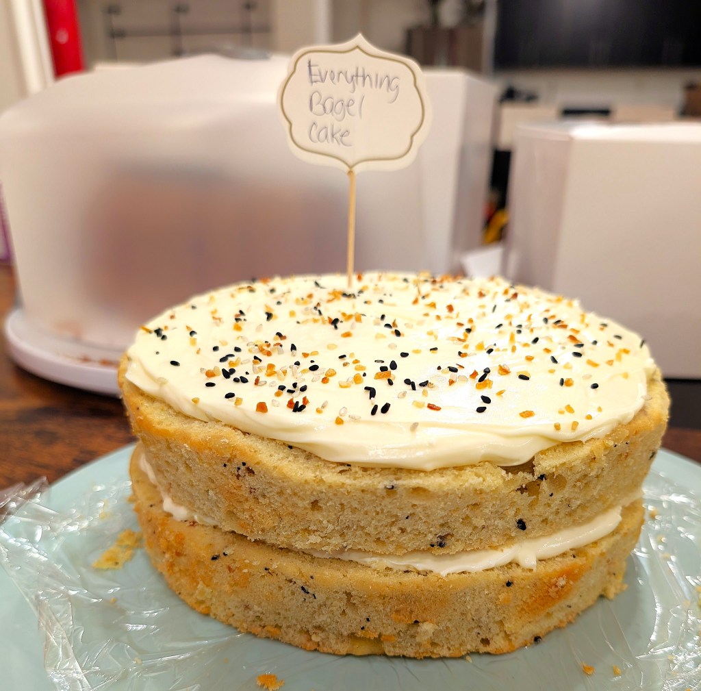 The NYT published a best bagels story in October 2024 and I also noted “Respect The Schmear: Bagel Pros Say THIS Is The Ideal Amount Of Cream Cheese” from the Huffington Post. The former informed me that a NYC cupcakery operates a bagel shop in Brooklyn and the latter is somewhat relevant to what I’m doing on Oct. 26, 2024. I created an everything bagel cake and it’s making its public debut at the Cake Picnic.