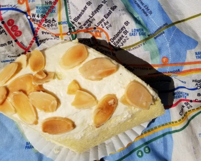 The second bakery had no cookies, but offered a slice of almond cake. Sold. When everything is nuts, modifications are to be expected. With no seating, I composed a picture on a stoop with props on hand. It was indeed a memorable National Chinese Almond Cookie Day.