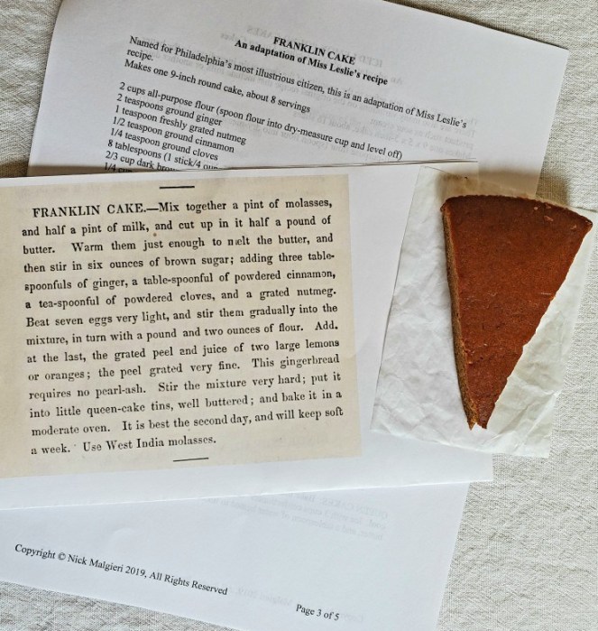 Chronologically, the next cookbook that factors into cupcake history is by Eliza Leslie. In 1828, she published a “cup cake” recipe that is the first known use of the term. In May, I attended a demonstration by veteran pastry chef Nick Malgieri, who made a number of cakes based on Leslie’s recipes. Gingerbread was among his historical tributes.