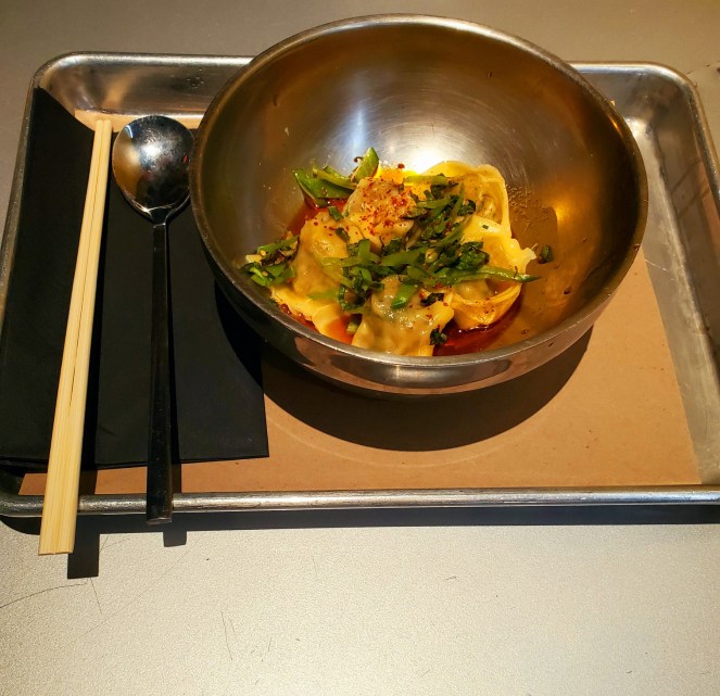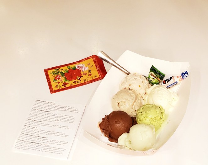 Before my dumplings x 2 dinner, I had dessert. Here is the Ice Cream Jubilee Lunar New Year sampler. Flavors are roasted barley tea, red bean almond cookie, matcha green tea, citrus Sichuan peppercorn, chocolate yuzu, and ume plum sesame leaf.