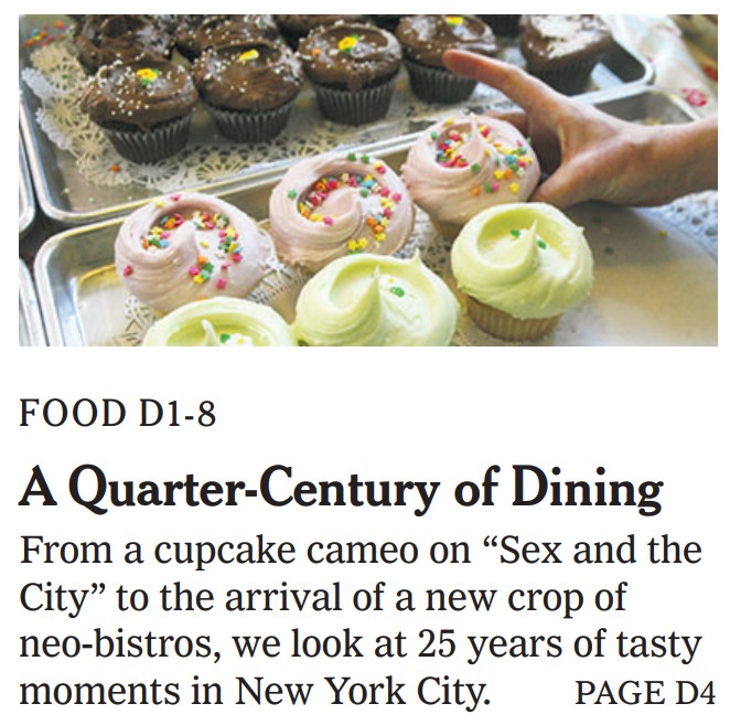 In “25 Years of N.Y.C. Dining,” the New York Times highlights “major food moments … that changed life in New York City in the first quarter of the 21st century.” Magnolia cupcakes are the first entry in the timeline, published in the May 28, 2025, print edition. Of all the imagery that could have been chosen for the front-page teaser, it is Magnolia cupcakes that are pictured.